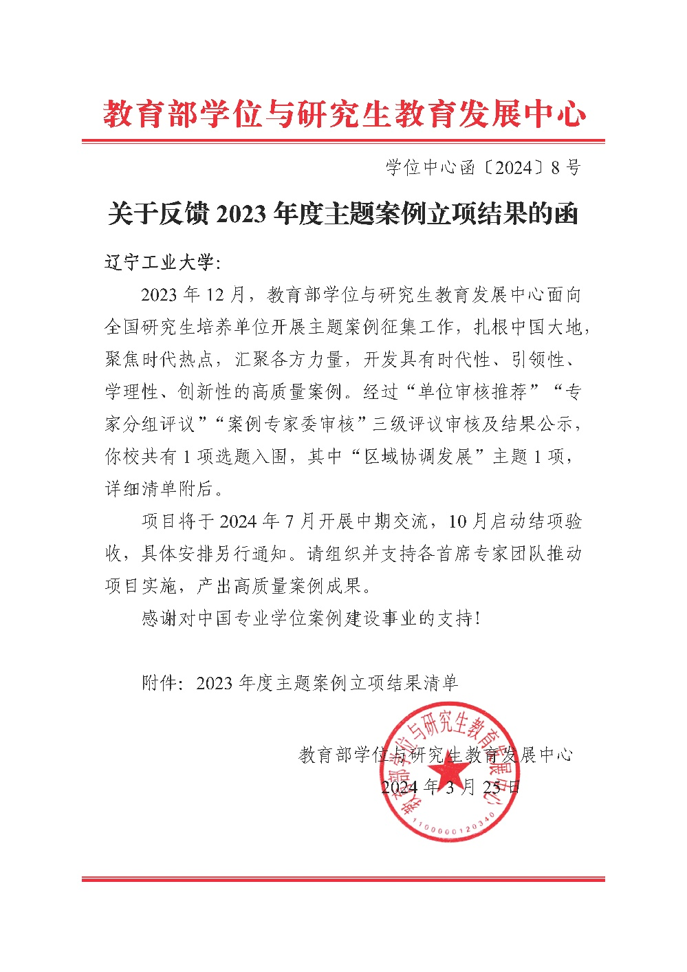 教育部学位与研究生教育发展中心2023年主题案例征集工作围绕“大国智造”“中华传承”“区域协调发展”和“走出去”四个主题,旨在扎根中国大地,聚焦时代热点,汇聚各方力量,开发具有时代性、引领性、学理性、创新性的高质量案例,为建构中国自主知识体系提供案例资源。辽宁省高校共22个项目入围,其中4项为“区域协调发展”主题。