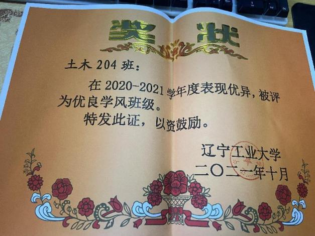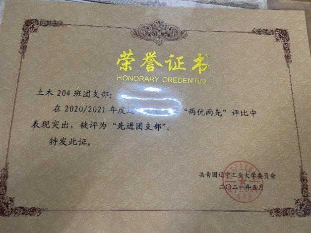 在2020-2021学年中,土木204支部被评为先进团支部,团支部有1名同学被评为“校优秀共青团干部”、3名同学被评为“校优秀共青团员”。土木204班荣获优良学风班级,支部员工中1人获得国家励志奖学金,1人获得省政府奖学金、4人获得校一等奖学金、3人获得校二等奖学金、2人获得校三等奖学金。