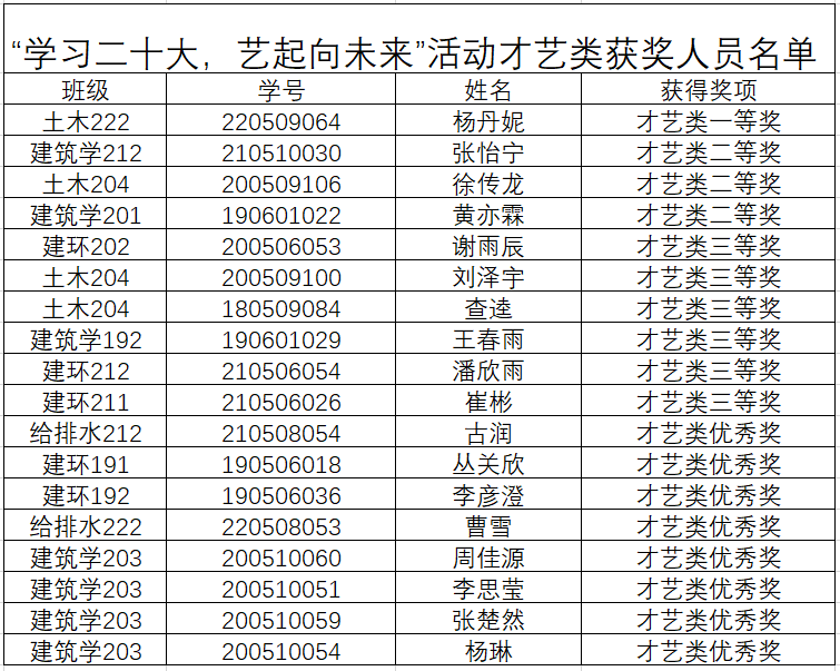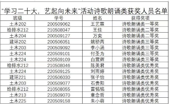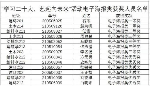 本次系列活动面向公司全体同学征集诗歌朗诵、才艺表演以及电子海报三类作品,同学们积极踊跃报名参加。通过对征集的所有作品分类评选,共有45份优秀作品脱颖而出。最终,土木202班王艺霖等3名同学的作品荣获一等奖;给排水212班王佳等7名同学的作品荣获二等奖;建环202班姚骄芮等14名同学的作品荣获三等奖;给排水212班陈美君等21名同学的作品荣获优秀奖。具体获奖名单如下:
