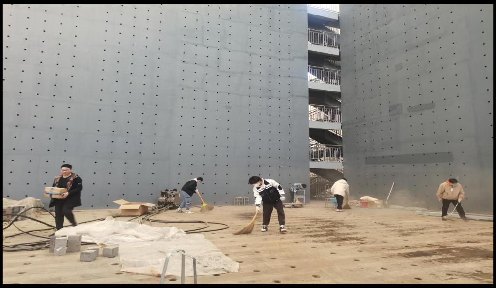 志愿者在实验大厅收拾杂物并清扫灰尘