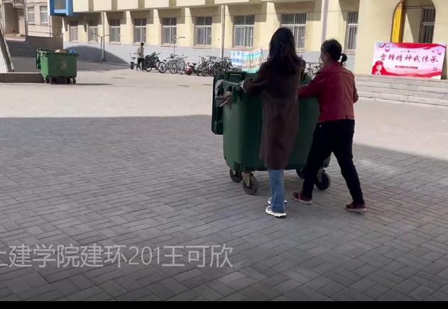 志愿者在宿舍楼下主动帮助清洁阿姨推垃圾箱
