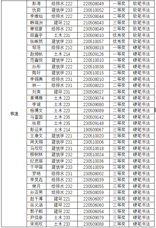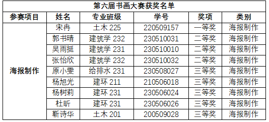 本次大赛受到了同学们的热情响应,共收到182幅内容丰富、创意新颖的书画作品。经过初赛的选拔,共有书法类作品77幅、海报类作品16幅入围最终的决赛。经评审,建学221班范鑫悦、给排水222班彭涛、土木214班赵婍帆、给排水212班邹浩、土木225班宋冉分别夺得书法比赛与海报制作一等奖;建学222班孙彤等15人获得二等奖;土木224班刘雨婷等25人获得三等奖。获奖作品面向公司全体员工展出,吸引同学们互相观摩欣赏、学习交流。